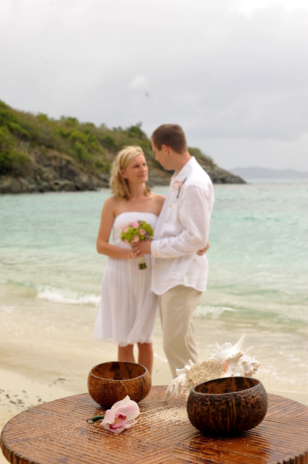 Andy & Asia were married last month on Jumbie Beach, St. John. They decided they wanted to have a sand ceremony (an island version of the unity candle) but the St. John Parks Department has a very strict policy against having glass on the beach. I came up with a very cute solution to this problem…I could almost title this “how to make the sand ceremony even more tropical”!