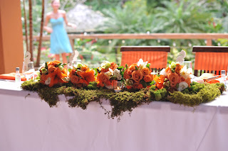 The florist used reindeer moss to create a table scape on the sweetheart table where we could lay the maids bouquets. Nice and inexpensive set up for the head table!
