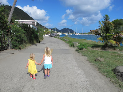 I hope everyone had a relaxing weekend! We took the family over to Tortola and spent the night at Myett’s in Cane Garden Bay. It is a perfect honeymoon spot! I love how close we are to the BVI. It was just a 30 minute ferry ride from St. Thomas. My girls had the best time – they LOVE staying in hotels. Here is a picture of them walking to the ferry in Soper’s Hole…don’t they look like little flower girls?? I’m waiting until they are bit older and will start including them in packages (just kidding).