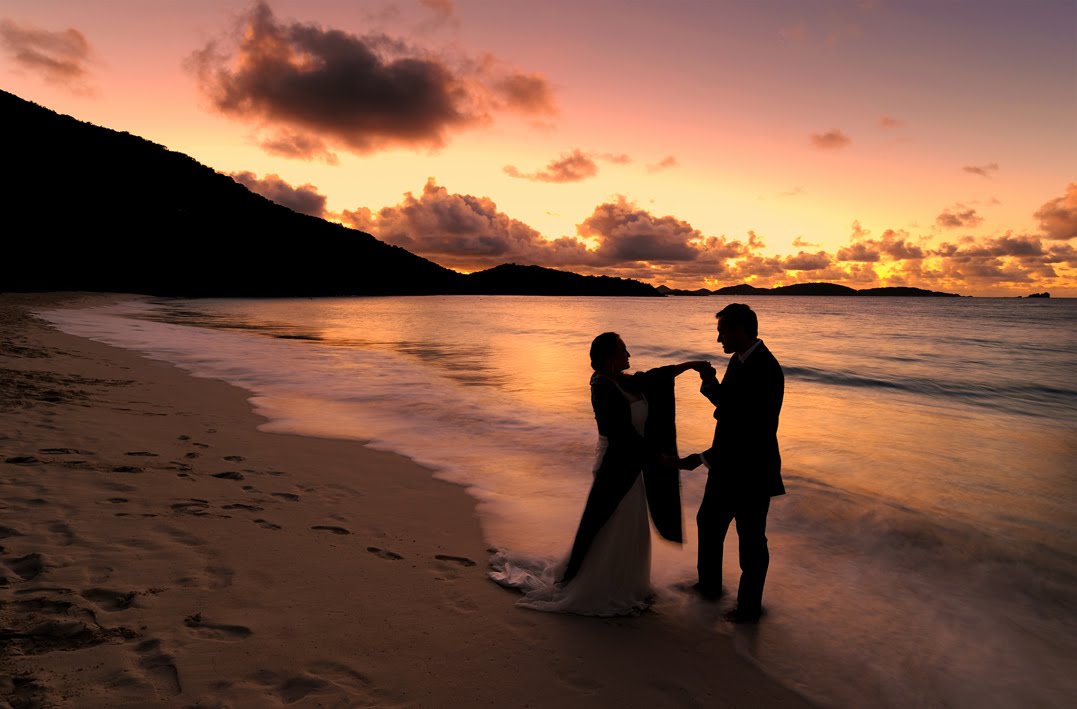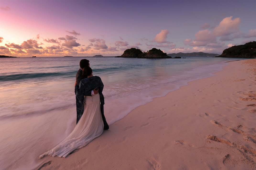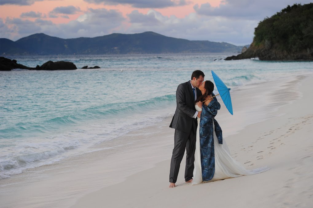 I felt so bad for this bride & groom! They put so much work into their wedding and then 10 minutes before the ceremony was to start, the skies opened up and it rained for the next hour. Right through sunset. =( We gave them some options…take the ceremony back to their villa, wait for the rain to stop, or hold the ceremony under one of the pavilions at Trunk Bay. We decided to wait for it to stop, but it was pretty dark by time the ceremony started. Many many kudos to Alain Brin of Blue Glass Photography and the magic of him camera for capturing these images with such little natural light!