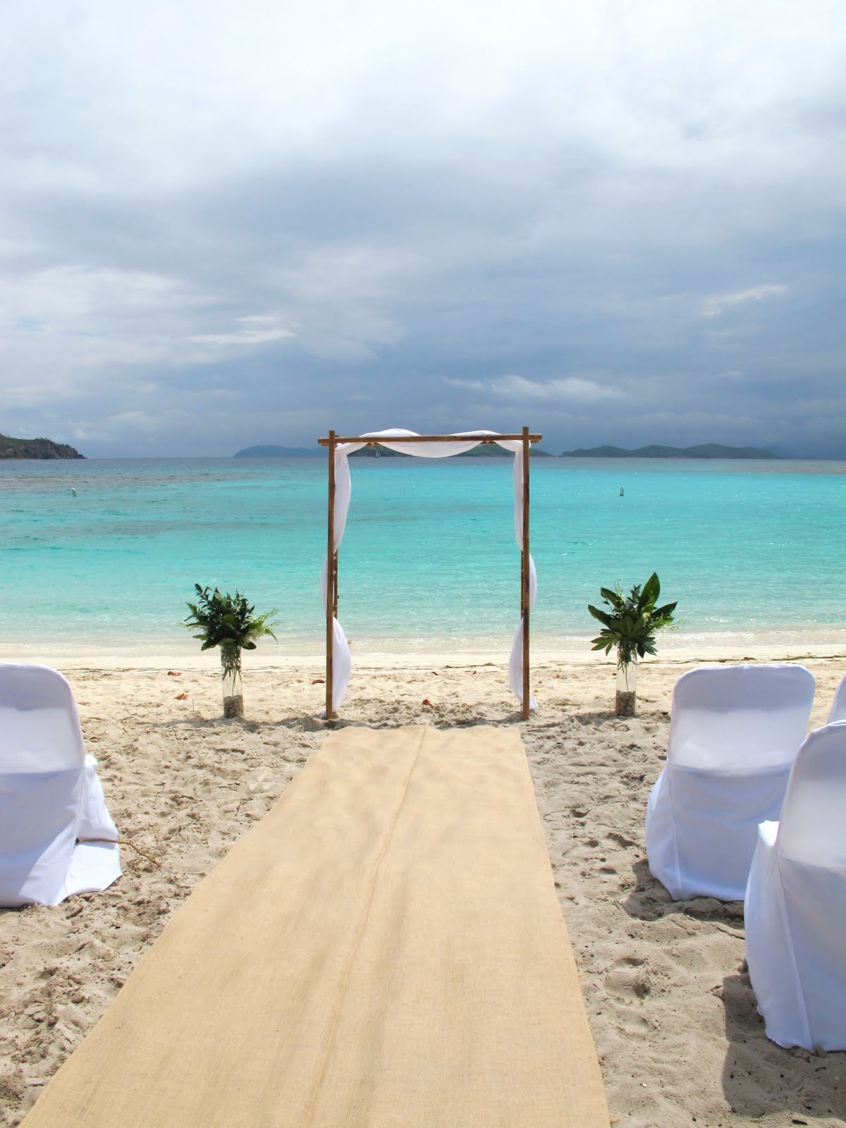 I normally do NOT like runners on a beach AT ALL. Most runners are made for a church wedding and are not very wide – just to go down the center of an aisle, not all the way to the edge. So when put on the beach, this is barely enough room for the bride and her escort, so it makes it very awkward to walk on. Not to mention, it is now on a soft surface (sand) and not a solid surface so they wrinkle up horribly. But, my mind just may be changed when it comes to burlap runners. Wide, strong, and very natural looking on a beach setting….check out the photos from a wedding we did last week at Lindquist Beach: