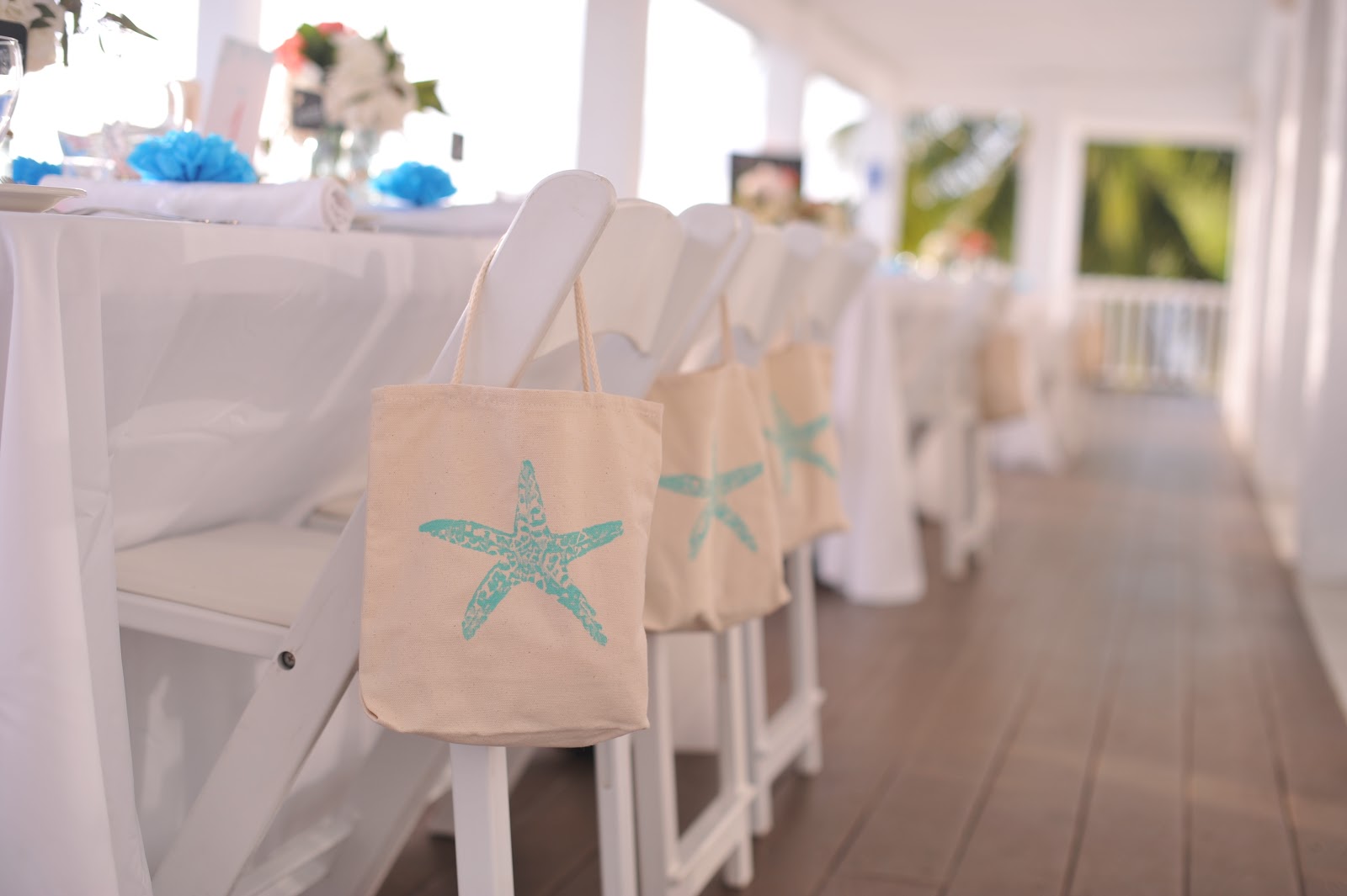 | Great way to use your bouquets after the ceremony for decor – rented blue mason jars with starfish decor |