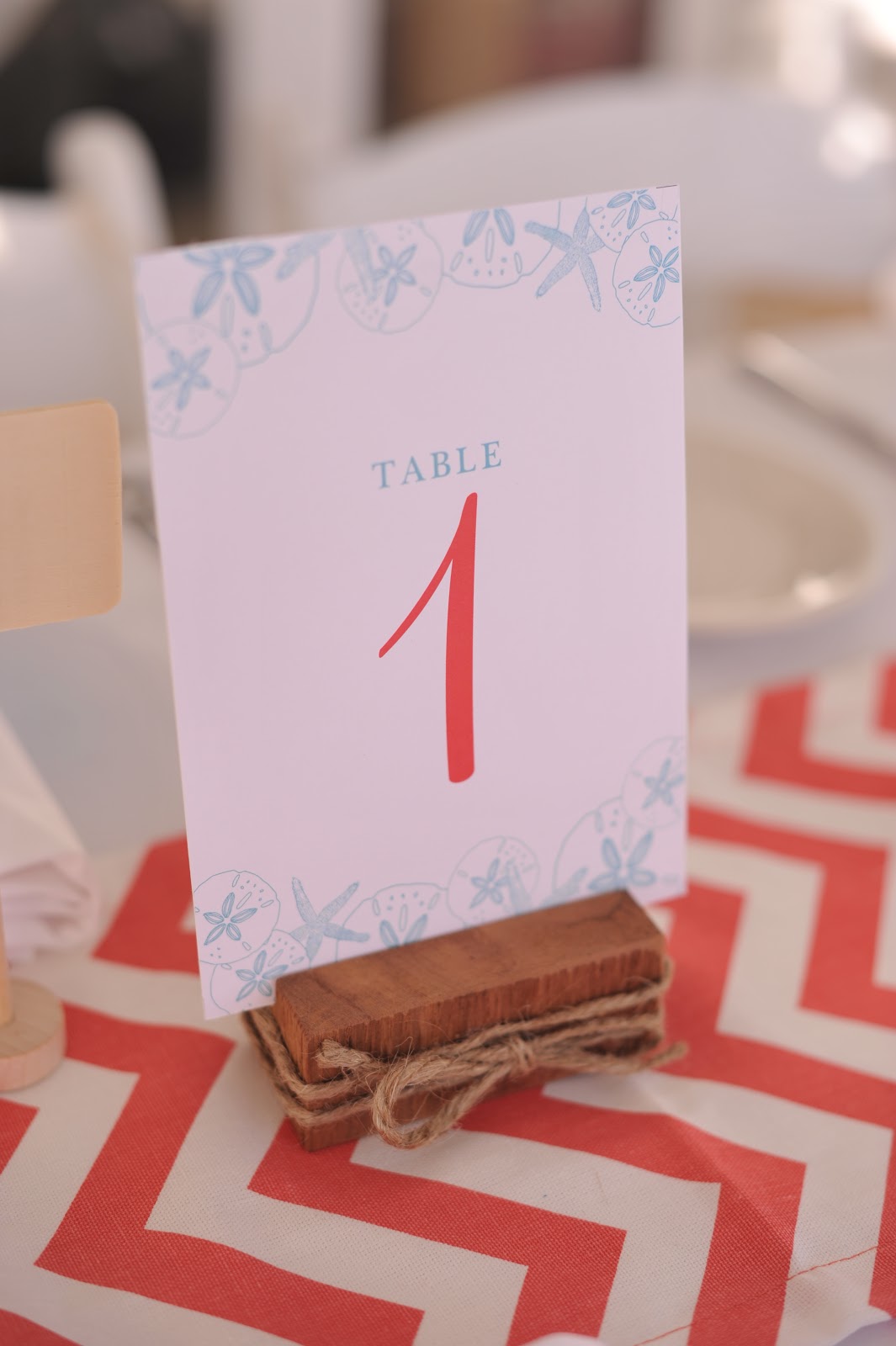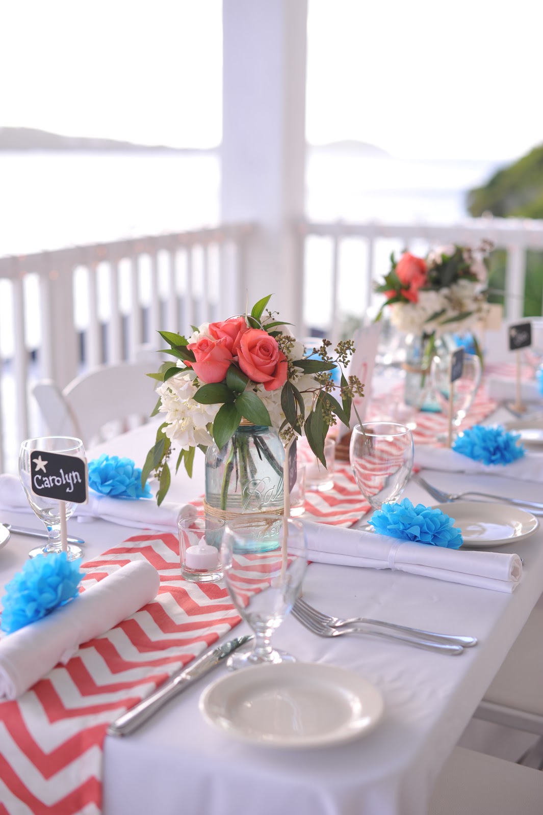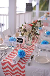 Also from Etsy were these gorgeous coral colored chevron table runners. The bride had told me about the blue poms she planned to use on each table setting and I wasn’t really sure how that was going to look but wow, I loved it! The coral and blue combos are so pretty.