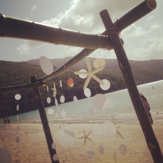 But back to that expensive part…they are. Last month though, I assisted a bride that used to live here in St. Thomas and the bride informed me that her husband to be planned to build their own arch and would decorate it themselves. I couldn’t wait to see it as he cut down fresh bamboo (the pretty green color) and she hang these beautiful shells on the arch.