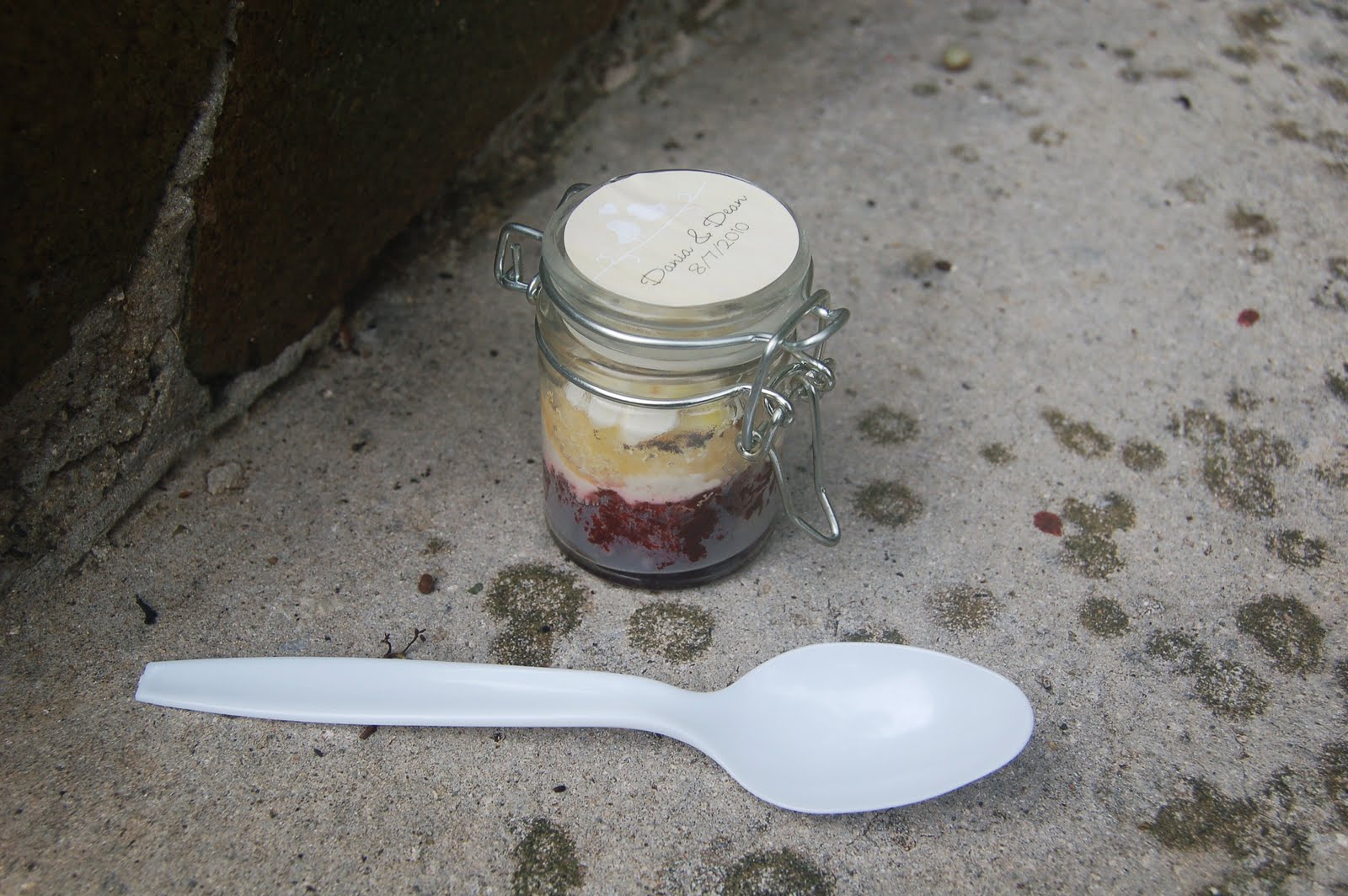 I took pictures before they were fully assembled. They used ribbon to tie a spoon to them and were set out prior to the guests leaving, so they could take the little snack with them. I think it would have been adorable with a little silver gellato spoon as well.