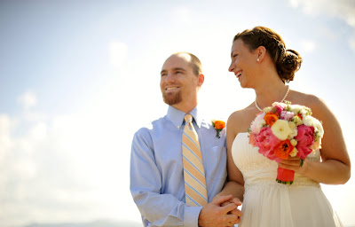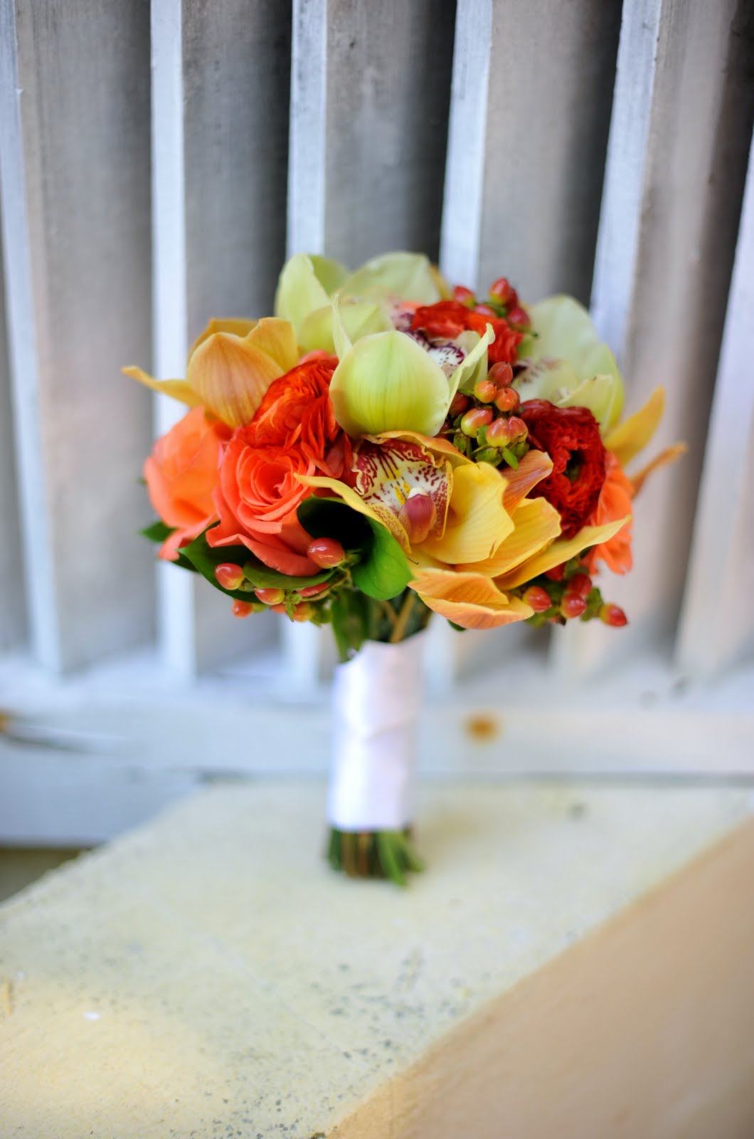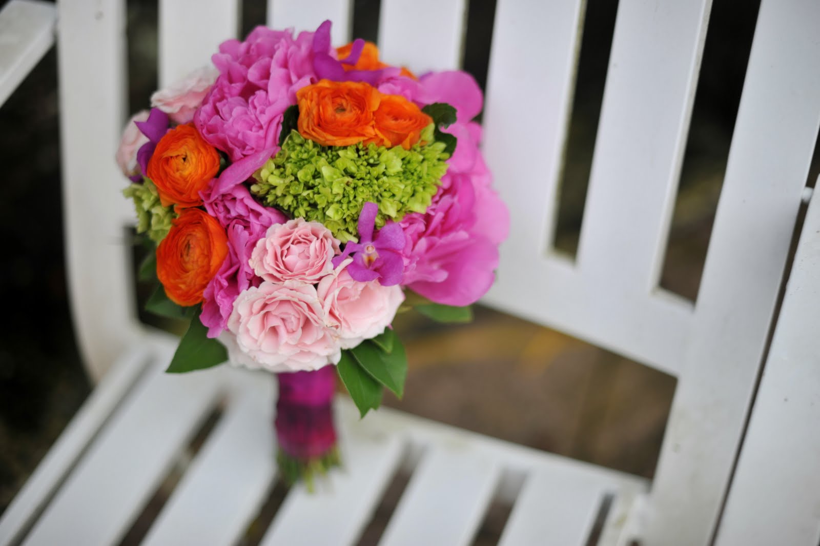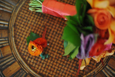 Her order? She paid a slightly higher fee, just $40 more than her package price, to get a slightly larger bouquet with upgraded flowers. She did not specify what flowers she wanted, just hot pinks, bright greens, bright oranges and NO gerbera daisies. We let the florist know that she liked orchids, anemone, ranunculus, ruffled roses, hydrangea, peonies, green viburnum, orange roses, and arum/calla lilies. The florist has freedom to use those colors and knew that the bride was paying slightly more so she tired to use as many of the requested flowers as she could, without guaranteeing anything. The bride was thrilled with her bouquet. The boutonniere was pretty cute too.