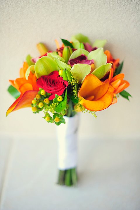 You can get a bit specific on things you like, as well as things you do not like, but these are never guaranteed unless you are paying a higher price. Bride D asked for: pinks, oranges and yellows. NO gerbera daisies. Likes: lilies (orange & yellow), orchids (green cymbidiums, blue & purple dendrobiums), gloriosa lilies, roses…lots of color. Boutonniere to be an orange flower. Here is what she received:
